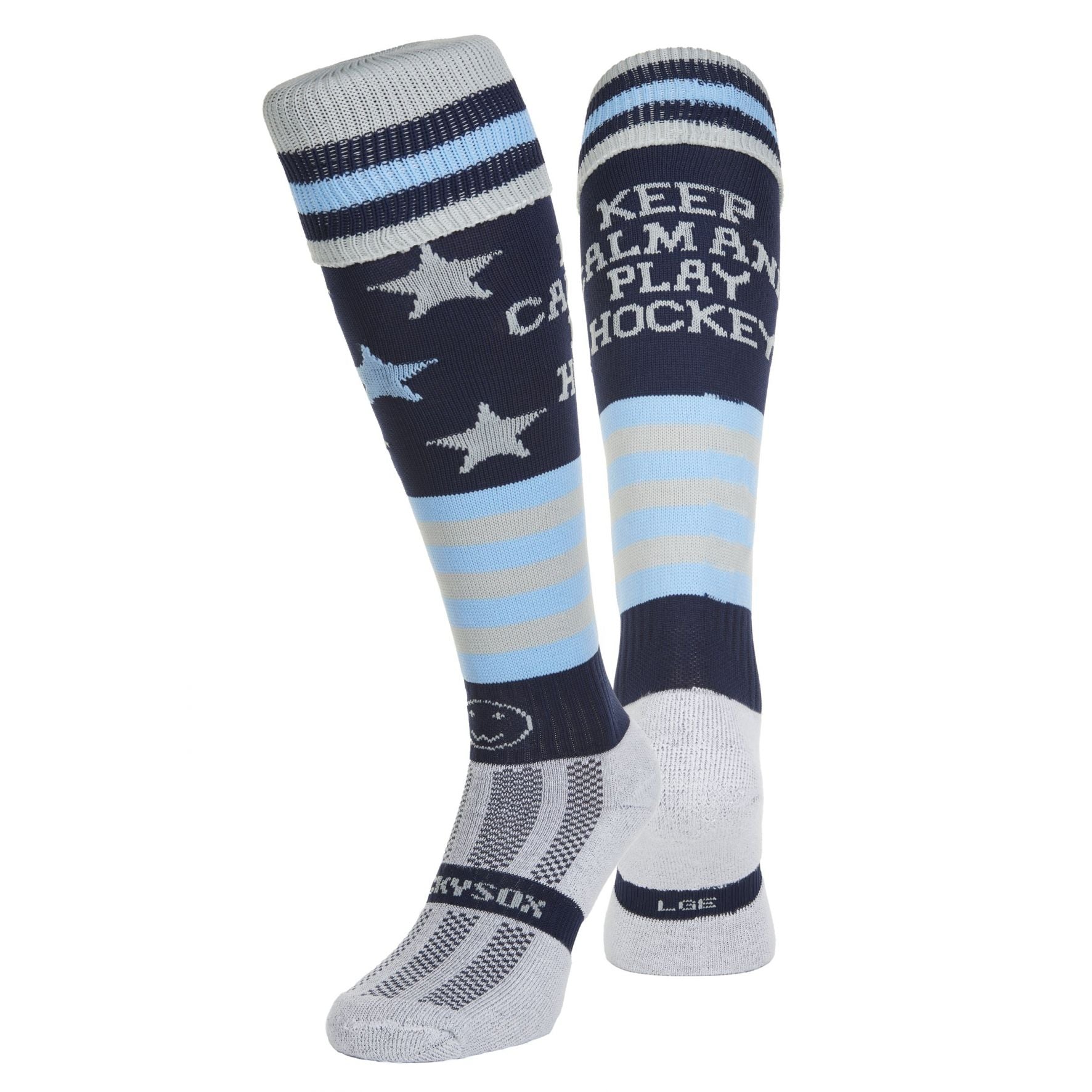 - Hockey Addict Pink WackySox are a neon pink knee length sock with the image of crossed hockey sticks in black on the front of the leg under a red heart and the words Hockey Addict in black on the back of each leg with the O replaced with a red heart. There is a black Wacky Face logo at the front of each ankle.